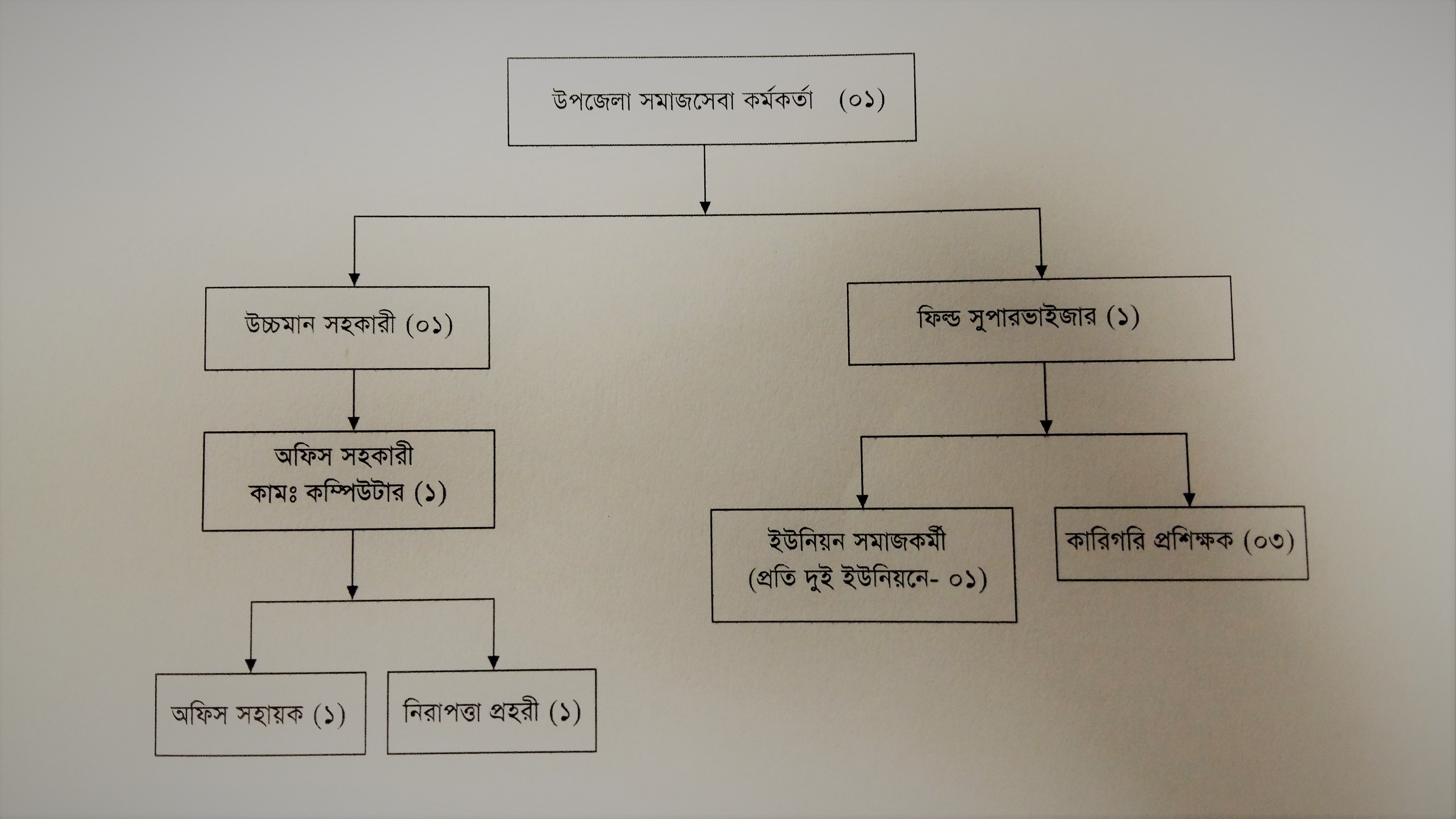 সমাজসেবা অধিদফতরের বিশাল কর্মযজ্ঞ বাস্তবায়নে মাঠ পর্যায়ের এই অফিসে উপজেলা সমাজসেবা অফিসারের নেতৃত্বে রয়েছেন একজন ফিল্ড সুপারভাইজার ও একজন উচ্চমান সহকারি যুক্ত হিসাব রক্ষক। কর্মসূচি সুষ্ঠু ও সফলতার সাথে বাস্তবায়নে সহযোগিতায় রয়েছে ৬ (ছয়) জন প্রশিক্ষিত ইউনিয়ন সমাজকর্মী ও ২ (দুই) জন প্রশিক্ষিত কারিগরি প্রশিক্ষক।